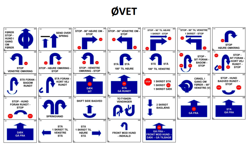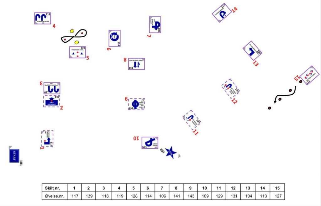 For hvert skilt er der en helt klar beskrivelse for hvordan øvelsen skal udføres, samt hvad der giver fratræk. I den øvelse. Banen skal gåes i den rækkefølge som den er tegnet til.
